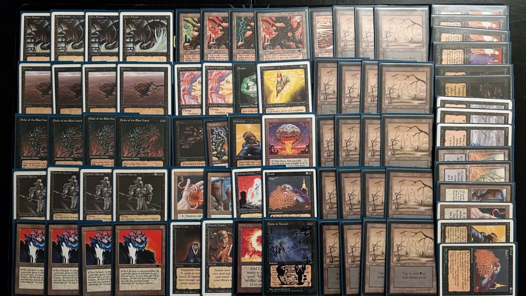 Swaffle is the only EU format that allows Fallen Empires, so obviously I HAVE to play multiple Fallen Empires cards. Since Hymn is the best FE card, I settle on a mono black list inspired by BrightDays’s T16 Derby deck from a few years ago. Restricted Hymn means I can play my Lobstercon 2024 copy without the art mismatch quietly grating on my nerves each time I draw it.